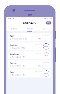 With Codinguru, you can test your knowledge of different programming languages. The application contains more than 1000 questions from more than 10 different languages. Check the popularity of programming languages in the Codinguru programming index. If you find an error, you can submit it with a simple form. Codinguru is free, no specific permissions required, but if you want more features, you can upgrade to Pro.