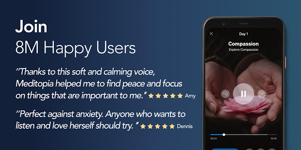 Meditopia is the leading application that helps you calm down, reduce stress, sleep well, love, find peace and start a deep discovery in yourself. You can create a space for yourself in life and discover inner happiness.
