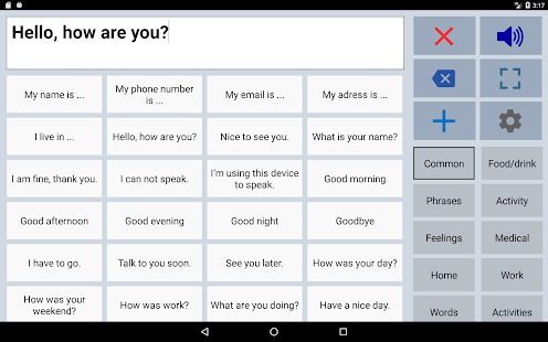 Speech Assistant AAC is a text-to-speech application designed for people with speech impairments, for example due to aphasia, MND / ALS, autism, stroke, cerebral palsy or others speech problems.