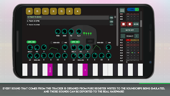 Each sound produced by this tracker comes from pure register written on emulated sound chips, and these sounds can be exported to the real material!