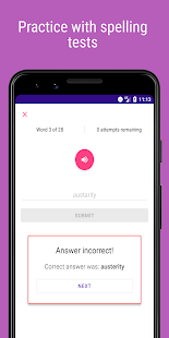 * Learn your words using the built-in practice mode, which currently allows flashcards and spelling tests.